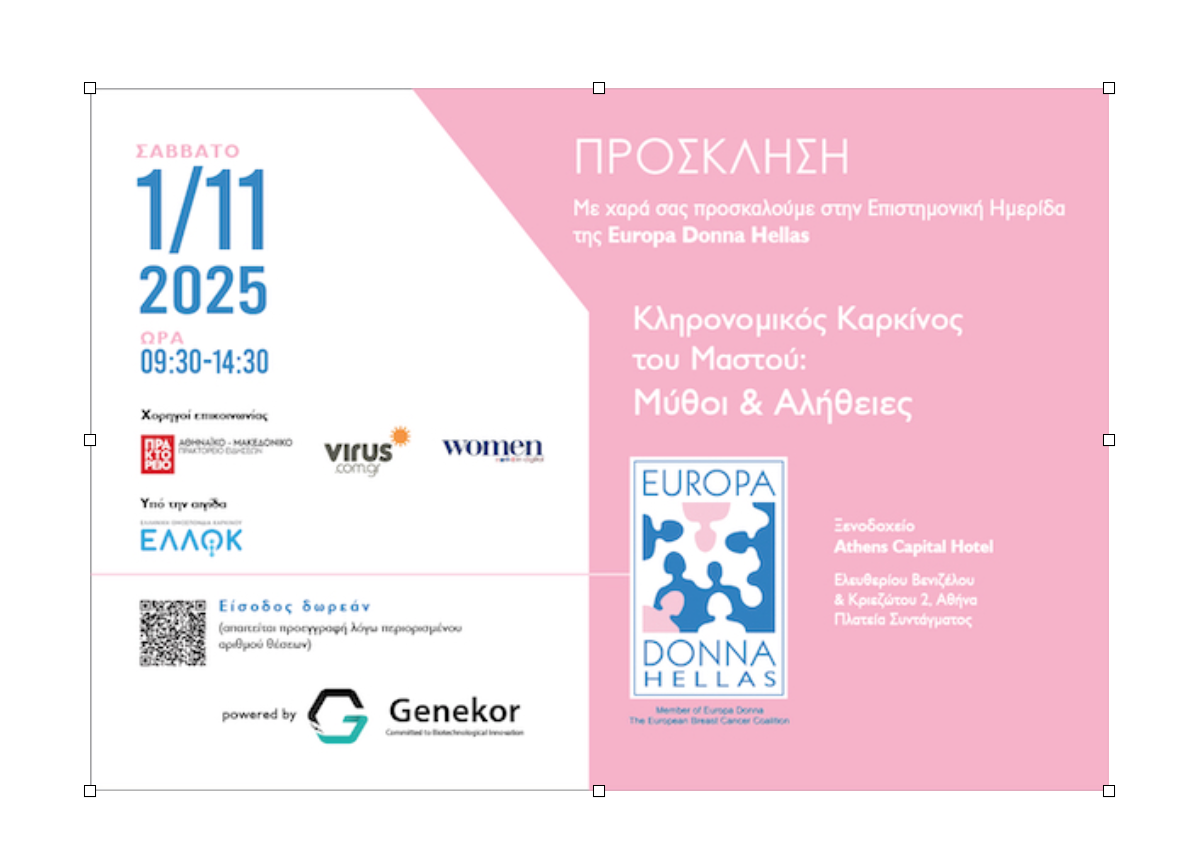 Το Σάββατο, 1 Νοεμβρίου 2025 και ώρα 09:30-14:30, θα διενεργήσει ενημερωτική Ημερίδα με θέμα “Κληρονομικός καρκίνος του μαστού: Μύθοι & Αλήθειες”, με την ευγενική χορηγία της Genekor. Η ημερίδα θα πραγματοποιηθεί στο ξενοδοχείο Athens Capital Hotel, Ελευθερίου Βενιζέλου & Κριεζώτου 2, Αθήνα, Πλατεία Συντάγματος, και θα είναι δωρεάν (απαιτείται προεγγραφή λόγω περιορισμένου αριθμού θέσεων).